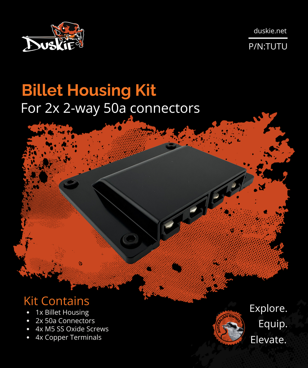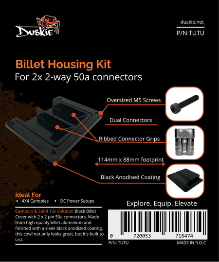 Transform your power connections with the Billet Black Slimline Double 50A Housing Kit. This is more than just a cover; it’s a robust, all-inclusive solution for creating a secure dual power point. Crafted from a single piece of anodized billet aluminum, its low-profile design adds a high-end, finished look to your setup.