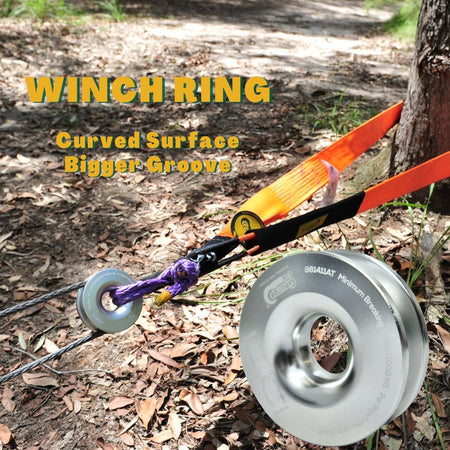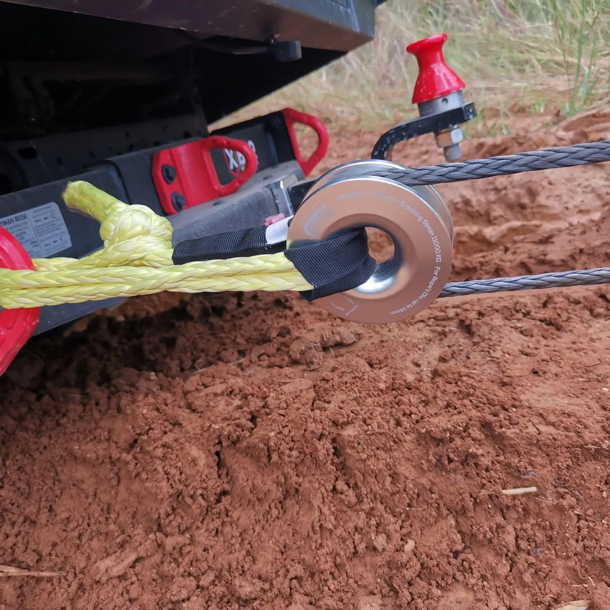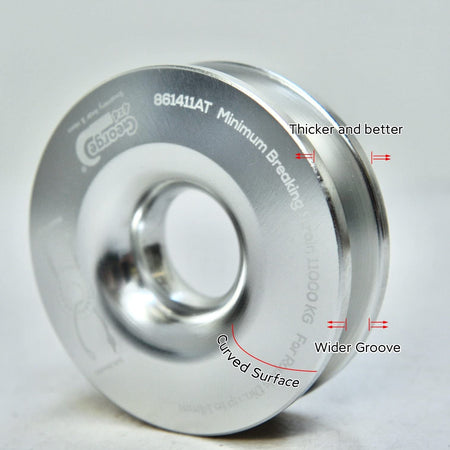 Snatch pulley ring is designed to fit soft shackle and synthetic winch rope. Snatch pulley rope ring CURVED SURFACE AND BIGGER GROOVE! features: Rated load 11000 Kgs, ///strictly tested in Australia by NATA certified lab. Load testing over 11000kgs without failure!. ////Solid aluminium machined and polished, lighter, safer and more durable Outer diam 100mm, inner diam 32mm. Rope running 8mm to 14mm /// Net weight: 0.39kgs.