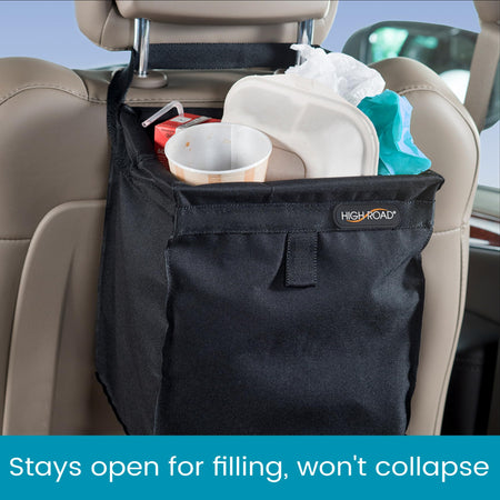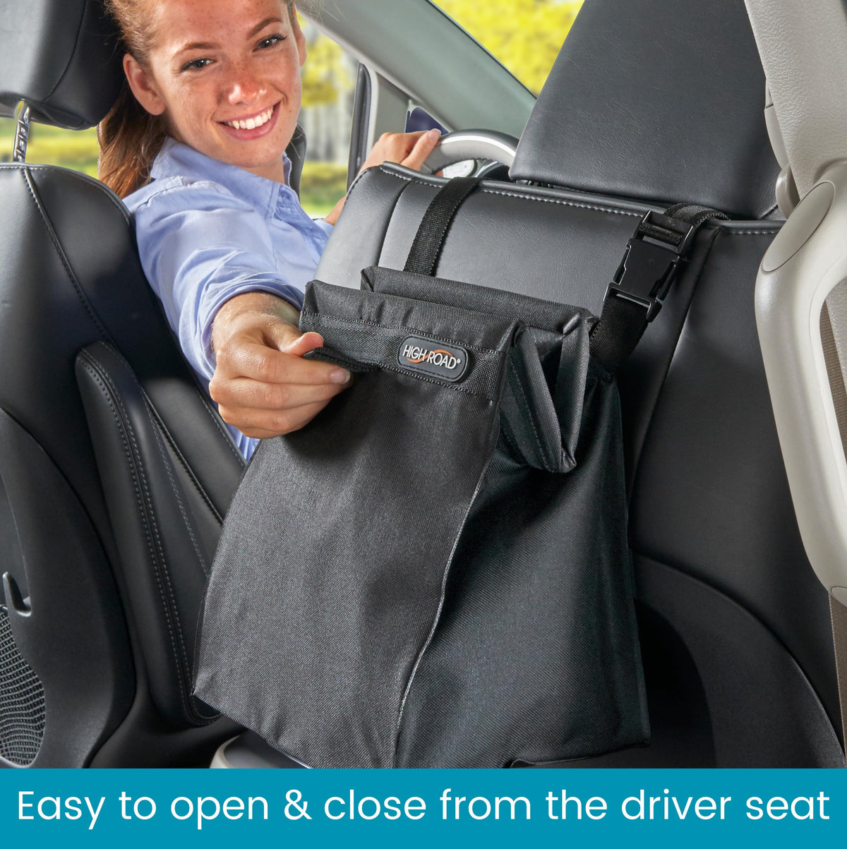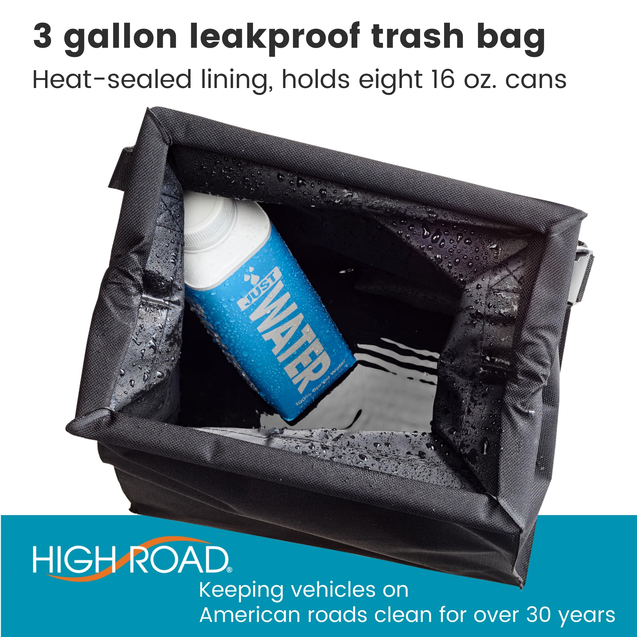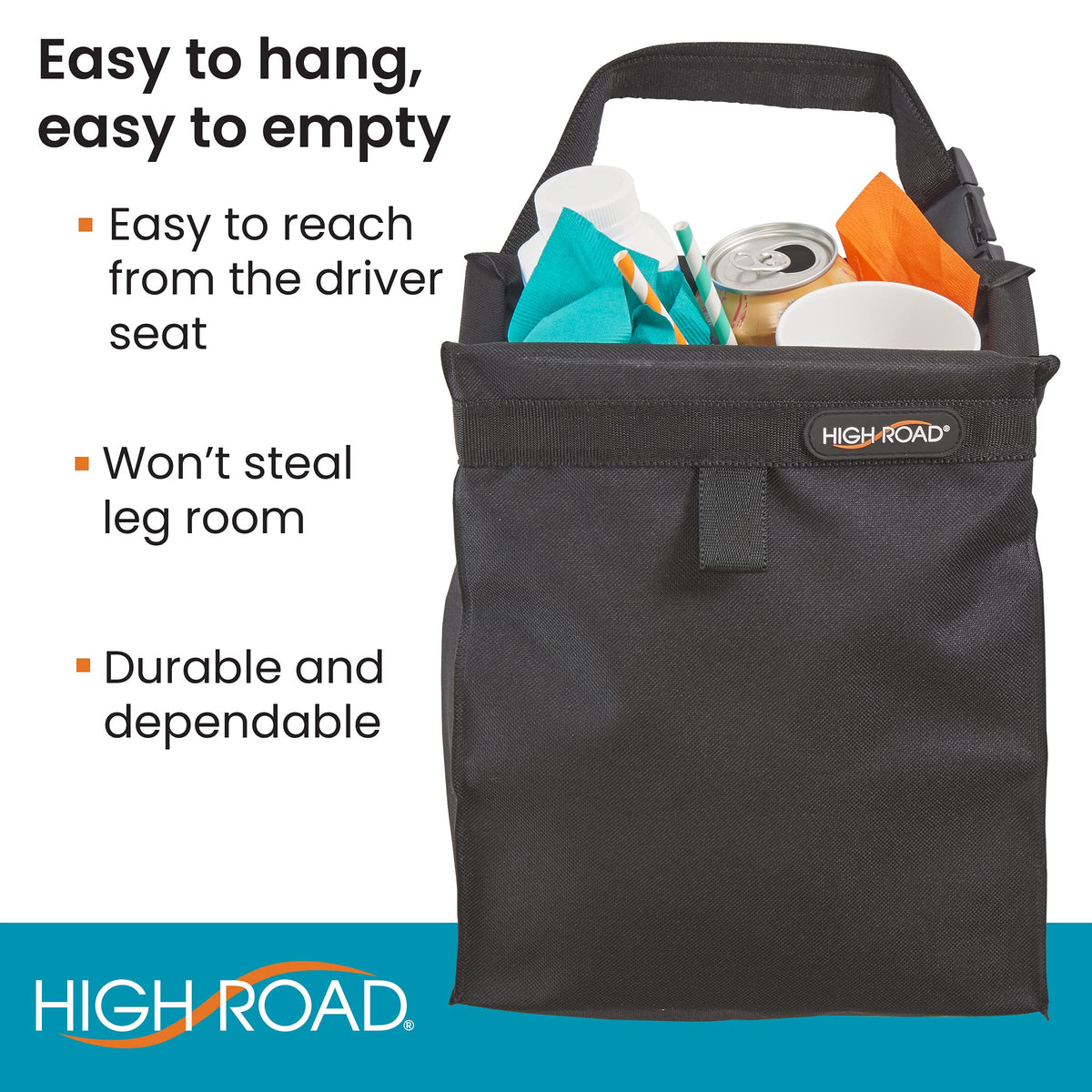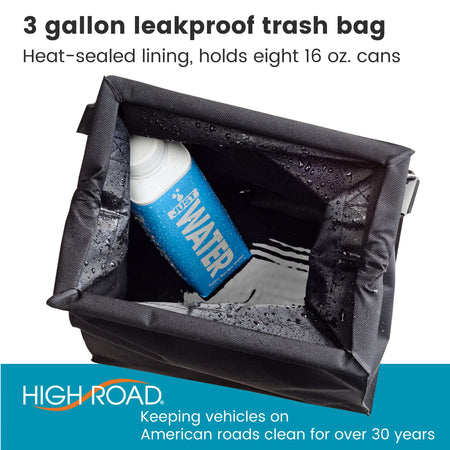 The original leakproof, hanging auto garbage bag. Designed and developed in 1989, the high road trash stash features a wipe clean, drip and spill proof liner, a tough, adjustable hanging strap, spring frame opening and cavernous 3-gallon capacity. A quick-release buckle makes the trash stash car trash bin easy to remove, empty and re-hang. Hangs high on the seat back to leave plenty of legroom with no tips or spills. hang on the passenger seatback for easy reach from the driver seat.