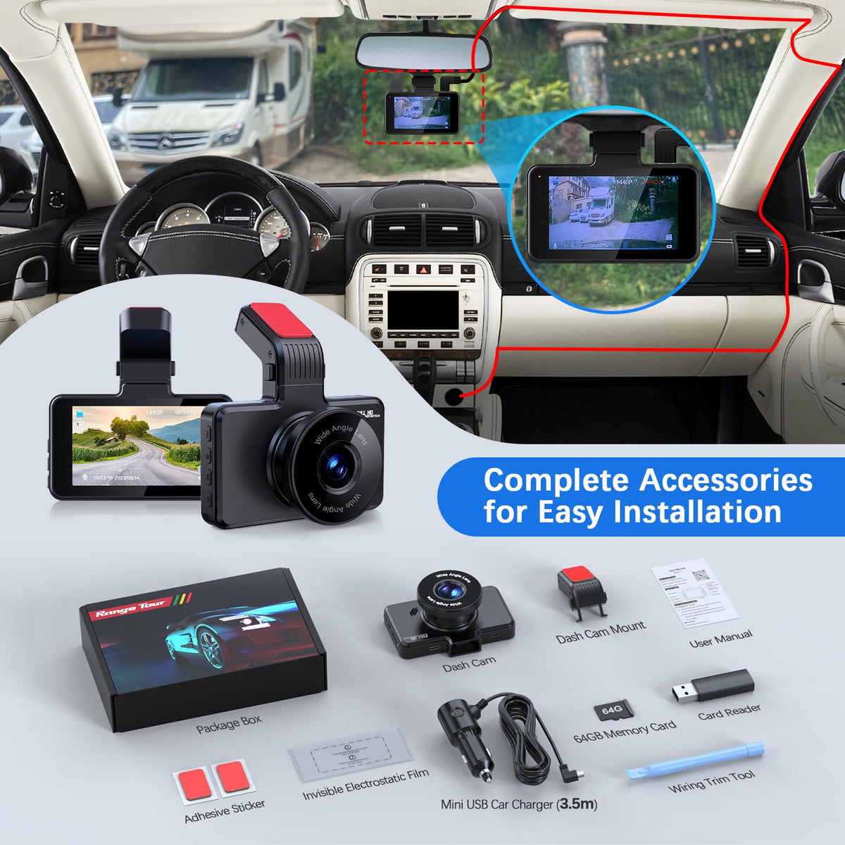 Range Tour Car Dash Cam Front, FHD 1080P Car Camera 170° Wide Angle WDR In Vehicle Dashboard Camera 3.0" Display Driving Recorder Car Video Camera Loop Recording, Night Vision, Motion Detection