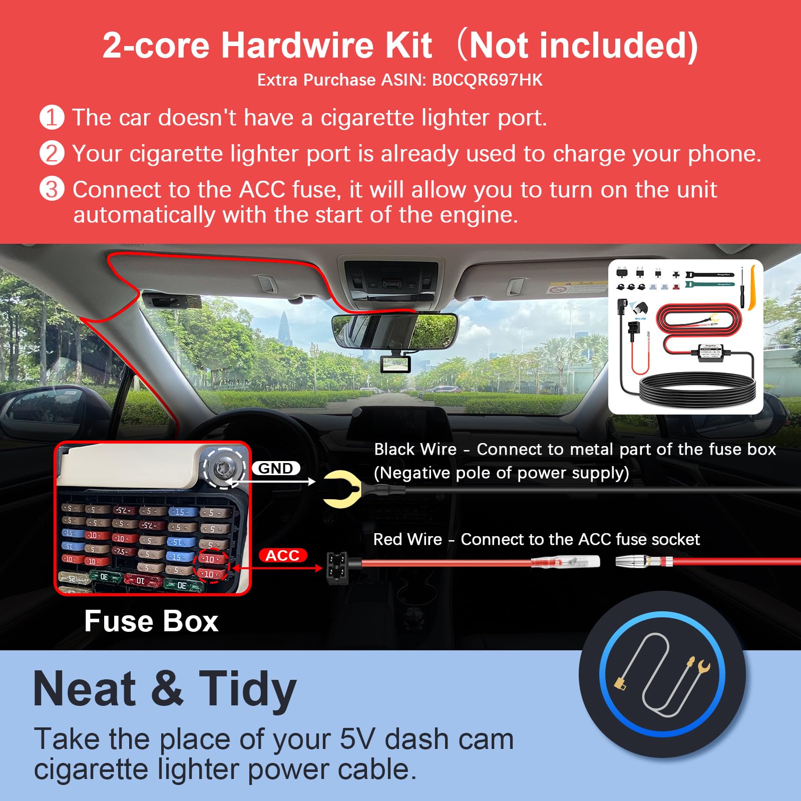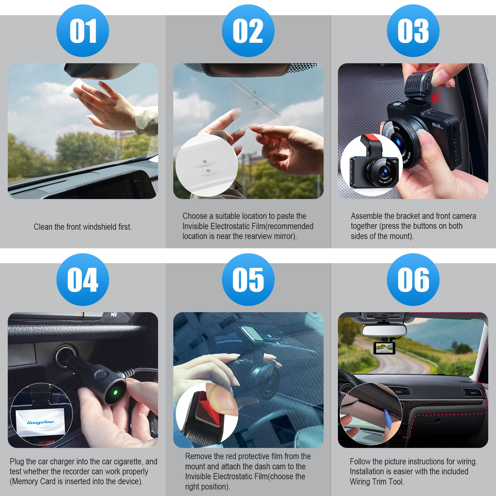 - 【Easy Set up & Installation】: Equipped with the 3M sticky mount for the dash cam, it is easy to mount on the car windshield. After connecting the car charger, hide the power cord in the car bezel via the Wiring Trim Tool, and the installation can be completed in a few minutes.