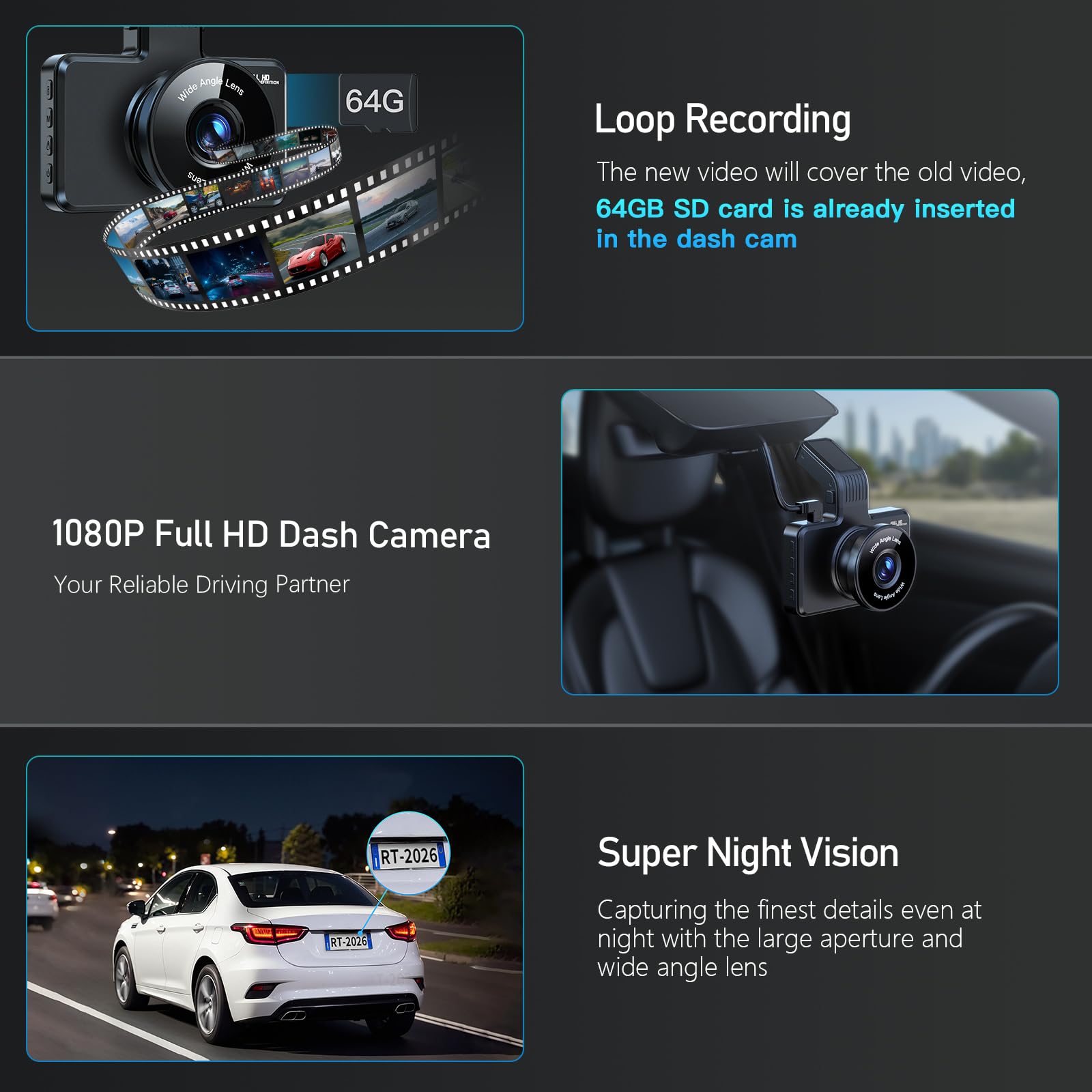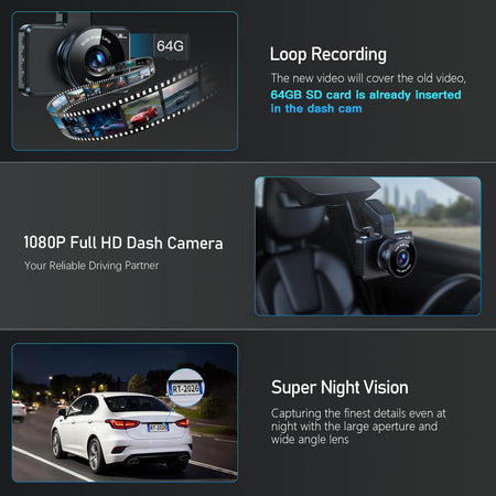 - 【64GB SD Card】: 64GB SD Card is INCLUDED in Driving Recorder. Please kindly be NOTED that the Dash Camera supports Max 256GB.