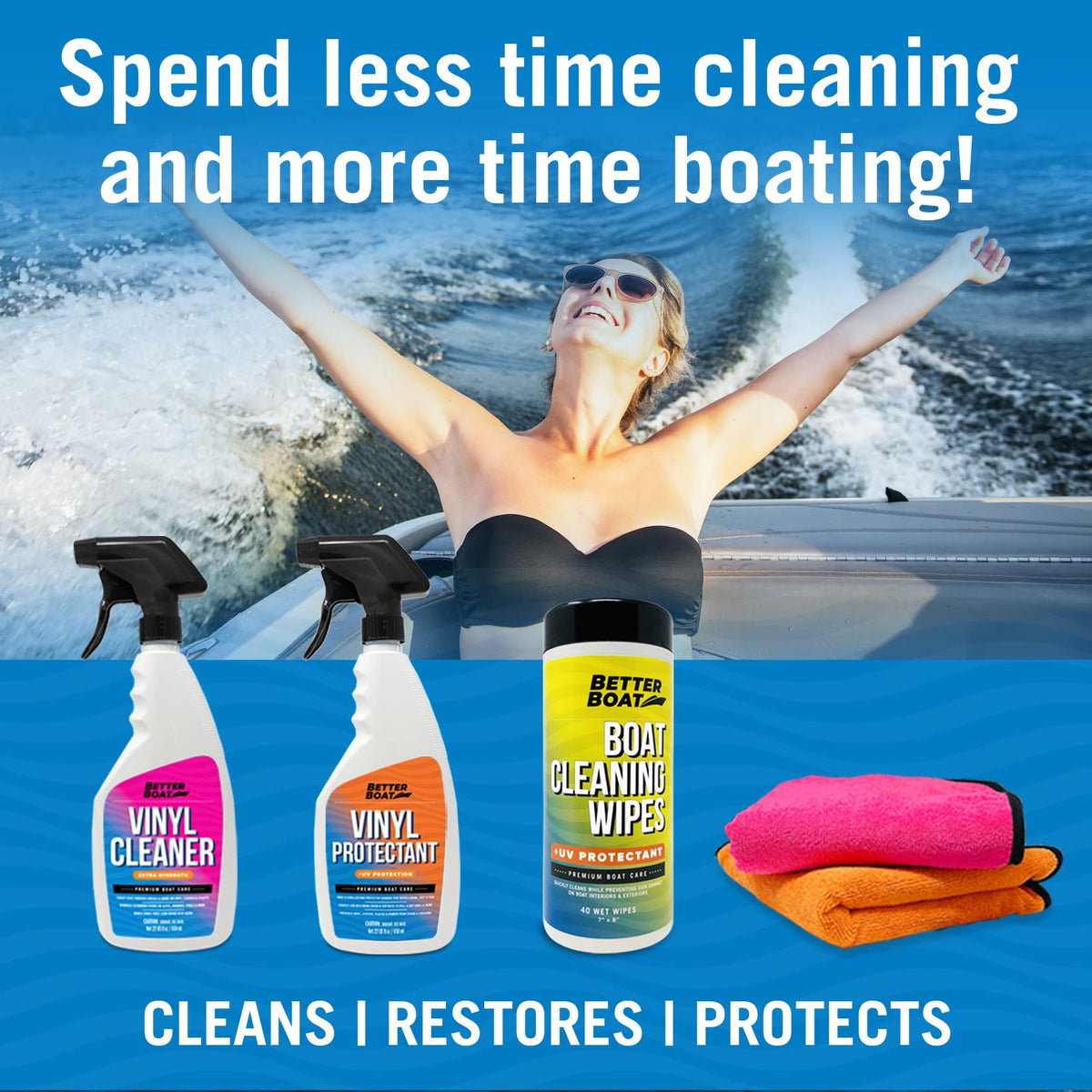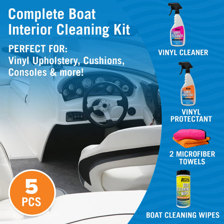 - COMPLETE INTERIOR CLEANING KIT: Our Boat Cleaning Supplies set includes our boat Vinyl Cleaner, Vinyl Protectant, UV Boat Wipes, 2 color-coded Microfiber Cloths & detailed instructions to complete your boat accessories set. The ultimate Boating Gift